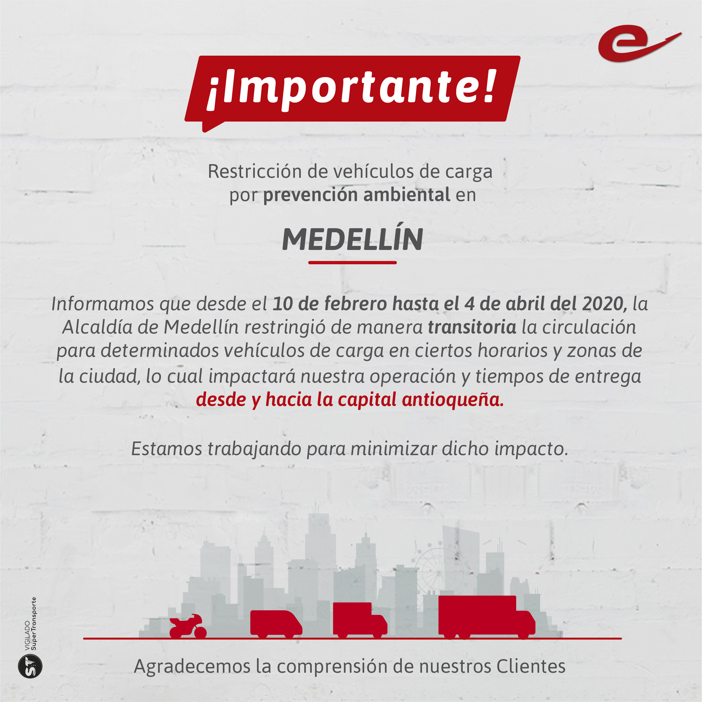 Desde el 10 de febrero hasta el 04 de abril del 2020, la Alcaldía de Medellín restringió de manera transitoria la circulación para determinados vehículos de carga en ciertos horarios y zonas de la ciudad, lo cual impactará nuestra operación y tiempos de entrega desde y hacia la capital antioqueña.